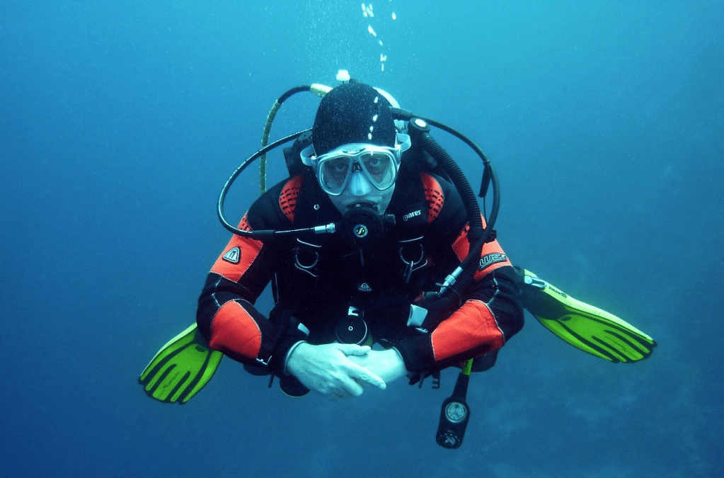 After the safety orientation, we were suited up with all of our gear for the next 45 minutes. Swim fins, boots to protect your heels from the fins, a vest that your tank would be mounted to, the tank, breathing regulator, and a mask. Headed over to the pool, where the instructor and his assistant set up the tanks, and then we donned the rest of the gear. Once we jumped in, he showed us how to clear the breathing regulator and pretty much turned us loose.