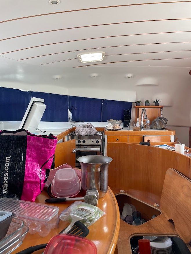 As a reminder, One Life is 41 feet long by 23 feet wide. So, the overall square footage of the boat is a little over 900 square feet (interesting, because even though we are renting an 1800 square foot house, we are only living in about 900 of it). But the 900 square feet is not all livable space. I would guess, we are probably at about 700 square feet of “livable” space. This means that all tools, fishing gear, food, clothes, pots and pans, all of those things that you have nice tidy spaces for in a house, have to find a home on the boat and that’s not always easy.