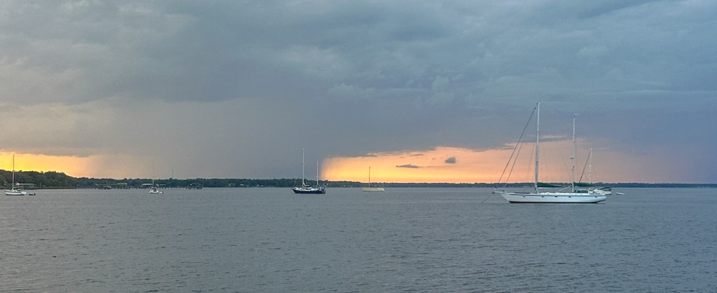 Winds picked up to 35 mph sustained and 55 mph gusts. I looked around outside and could see some anchor lights and lights on shore; I didn’t think we were moving, and our anchor alarms confirmed that we were staying at the end of the chain and just swinging with the wind and the current.